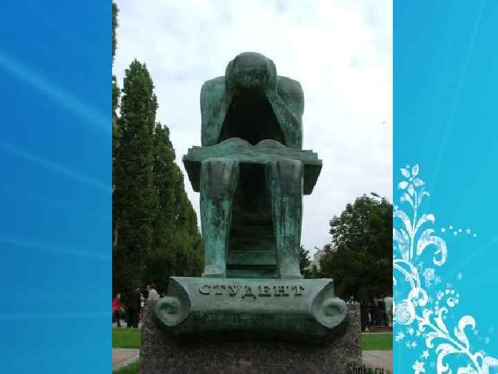 Памятник студенту • Где находится? • Возле входа в Саратовский государственный социально экономический университет. • Этот памятник обычному студенту, как отметили авторы идеи. Студент восседает на стопке книг (что, видимо, символизирует впитывание знаний абсолютно всеми частями тела) и усиленно зубрит какой то предмет. Поэтому неофициальное название памятника – «Ночь перед экзаменом» . • Авторы скульптурной композиции – братья Андрей и Сергей Щербаковы.