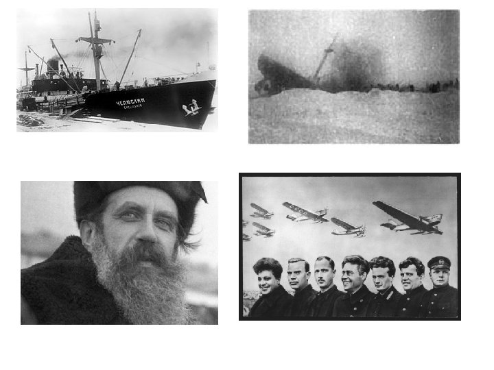• Отто Юльевич Шмидт- командир парохода «Челюскин» • На остров Врангеля должна была высадиться группа зимовщиков с семьями. Экспедиция завершилась драматически: по причине сильных ветров и течений, пароход «Челюскин» не смог выйти в Тихий океан. 13 февраля 1934 г судно было раздавлено льдами, вследствие чего в течение двух часов затонуло. 104 человека вместе с капитаном парохода О. Ю. Шмидтом, оказавшиеся на льдине, вынуждены были провести два месяца в условиях полярной зимы, пока их не спасла авиация. Летчики, снявшие с льдины челюскинцев, стали Героями Советского Союза: Ляпидевский А. В, Леваневский С. А. Молоков В. С. Каманин Н. П. Слепнев М. Т, Водопьянов М. В. Доронин И. В.
