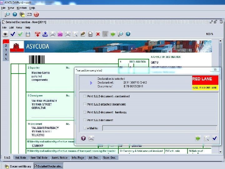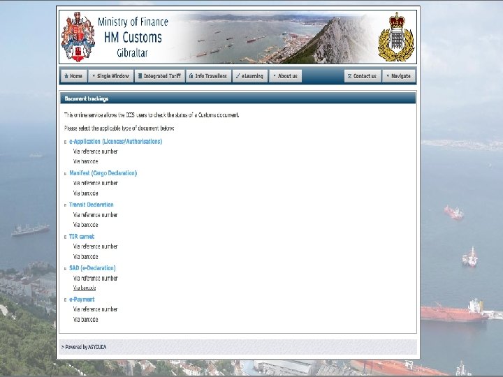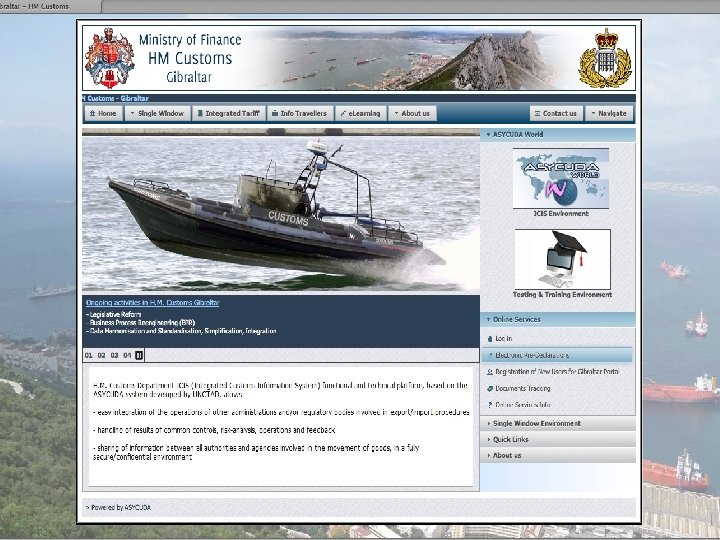 ASYCUDA Platform – Single Window National Single Window Components • It facilitate creation (Web forms; Full Desktop – Java enabled desktop, RIA – Rich Internet Application Interface, Light Desktop – PDA or Smartphone light interface) reception (XML or UN/EDIFACT messages), processing, exchange & distribution of information between all interested parties. • Standardised information can be collected via Single Window (web form, XML or UN/EDIFACT messages) to ensure compliance with Gibraltar laws relating to Customs, Immigration, Health and Wildlife Protection. (details are sent to relevant Control Agencies for screening against their enforcement databases. Port, Immigration and Customs clearance must be completed prior going ashore) • Access to the system controlled, in order to protect personal data, as regulated by the law on the protection of individuals with regard to the processing of personal data.