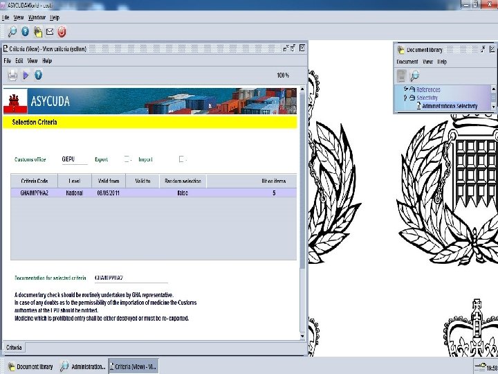 ASYCUDA Platform – Single Window Licenses, Authorisations & Permits Global Businesses Processes: • Management of an Application for License (request for license), Application for License from the creation of the e-application, to the reception by the competent National Authority and to the issuing of the License, License including evaluation of criteria to be met by the applicant; applicant • Management of a License, with all possible operations (e. g. License suspension, revocation, withdrawal of a License suspension revocation suspension, annulment of a License revocation etc); suspension annulment of a License revocation • Use of a valid License (validate Customs transactions vs. licenses data (cross validation between data supplied on SAD document against License related data) including automatic partial/total writing-off by SAD document(s) in Customs.