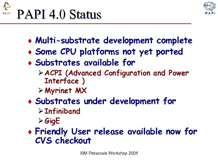 PAPI 4. 0 Status ¨ Multi-substrate development complete ¨ Some CPU platforms not yet ported ¨ Substrates available for Ø ACPI (Advanced Configuration and Power Interface ) Ø Myrinet MX ¨ Substrates under development for Ø Infiniband Ø Gig. E ¨ Friendly User release available now for CVS checkout IBM Petascale Workshop 2006