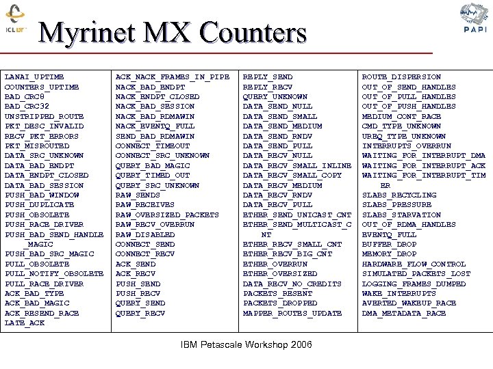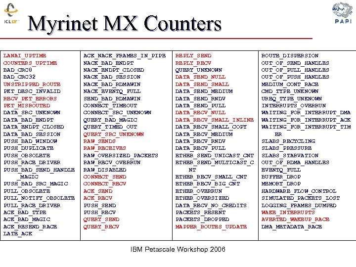 Myrinet MX Counters LANAI_UPTIME COUNTERS_UPTIME BAD_CRC 8 BAD_CRC 32 UNSTRIPPED_ROUTE PKT_DESC_INVALID RECV_PKT_ERRORS PKT_MISROUTED DATA_SRC_UNKNOWN DATA_BAD_ENDPT DATA_ENDPT_CLOSED DATA_BAD_SESSION PUSH_BAD_WINDOW PUSH_DUPLICATE PUSH_OBSOLETE PUSH_RACE_DRIVER PUSH_BAD_SEND_HANDLE _MAGIC PUSH_BAD_SRC_MAGIC PULL_OBSOLETE PULL_NOTIFY_OBSOLETE PULL_RACE_DRIVER ACK_BAD_TYPE ACK_BAD_MAGIC ACK_RESEND_RACE LATE_ACK ACK_NACK_FRAMES_IN_PIPE NACK_BAD_ENDPT NACK_ENDPT_CLOSED NACK_BAD_SESSION NACK_BAD_RDMAWIN NACK_EVENTQ_FULL SEND_BAD_RDMAWIN CONNECT_TIMEOUT CONNECT_SRC_UNKNOWN QUERY_BAD_MAGIC QUERY_TIMED_OUT QUERY_SRC_UNKNOWN RAW_SENDS RAW_RECEIVES RAW_OVERSIZED_PACKETS RAW_RECV_OVERRUN RAW_DISABLED CONNECT_SEND CONNECT_RECV ACK_SEND ACK_RECV PUSH_SEND PUSH_RECV QUERY_SEND QUERY_RECV REPLY_SEND REPLY_RECV QUERY_UNKNOWN DATA_SEND_NULL DATA_SEND_SMALL DATA_SEND_MEDIUM DATA_SEND_RNDV DATA_SEND_PULL DATA_RECV_NULL DATA_RECV_SMALL_INLINE DATA_RECV_SMALL_COPY DATA_RECV_MEDIUM DATA_RECV_RNDV DATA_RECV_PULL ETHER_SEND_UNICAST_CNT ETHER_SEND_MULTICAST_C NT ETHER_RECV_SMALL_CNT ETHER_RECV_BIG_CNT ETHER_OVERRUN ETHER_OVERSIZED DATA_RECV_NO_CREDITS PACKETS_RESENT PACKETS_DROPPED MAPPER_ROUTES_UPDATE IBM Petascale Workshop 2006 ROUTE_DISPERSION OUT_OF_SEND_HANDLES OUT_OF_PULL_HANDLES OUT_OF_PUSH_HANDLES MEDIUM_CONT_RACE CMD_TYPE_UNKNOWN UREQ_TYPE_UNKNOWN INTERRUPTS_OVERRUN WAITING_FOR_INTERRUPT_DMA WAITING_FOR_INTERRUPT_ACK WAITING_FOR_INTERRUPT_TIM ER SLABS_RECYCLING SLABS_PRESSURE SLABS_STARVATION OUT_OF_RDMA_HANDLES EVENTQ_FULL BUFFER_DROP MEMORY_DROP HARDWARE_FLOW_CONTROL SIMULATED_PACKETS_LOST LOGGING_FRAMES_DUMPED WAKE_INTERRUPTS AVERTED_WAKEUP_RACE DMA_METADATA_RACE
