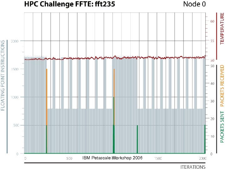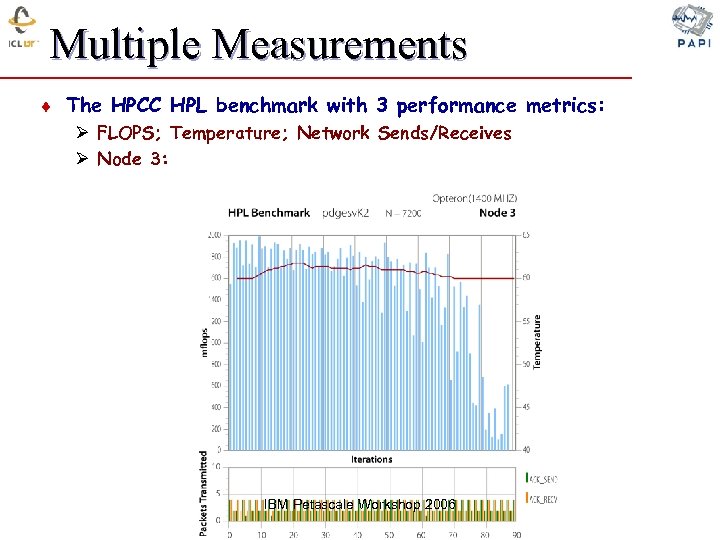 Multiple Measurements ¨ The HPCC HPL benchmark with 3 performance metrics: Ø FLOPS; Temperature; Network Sends/Receives Ø Node 3: IBM Petascale Workshop 2006