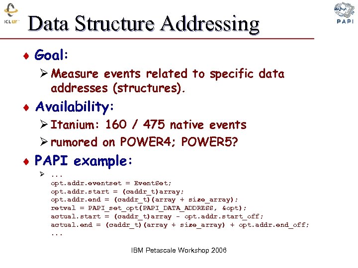 Data Structure Addressing ¨ Goal: Ø Measure events related to specific data addresses (structures). ¨ Availability: Ø Itanium: 160 / 475 native events Ø rumored on POWER 4; POWER 5? ¨ PAPI example: Ø. . . opt. addr. eventset = Event. Set; opt. addr. start = (caddr_t)array; opt. addr. end = (caddr_t)(array + size_array); retval = PAPI_set_opt(PAPI_DATA_ADDRESS, &opt); actual. start = (caddr_t)array - opt. addr. start_off; actual. end = (caddr_t)(array + size_array) + opt. addr. end_off; . . . IBM Petascale Workshop 2006