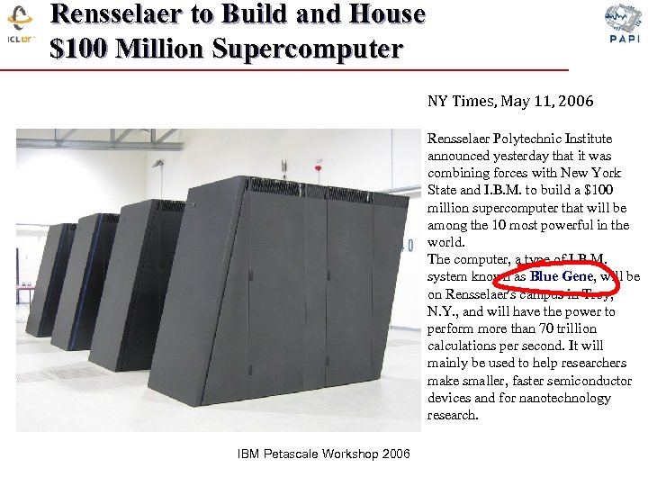 Rensselaer to Build and House $100 Million Supercomputer NY Times, May 11, 2006 Rensselaer Polytechnic Institute announced yesterday that it was combining forces with New York State and I. B. M. to build a $100 million supercomputer that will be among the 10 most powerful in the world. The computer, a type of I. B. M. system known as Blue Gene, will be on Rensselaer's campus in Troy, N. Y. , and will have the power to perform more than 70 trillion calculations per second. It will mainly be used to help researchers make smaller, faster semiconductor devices and for nanotechnology research. IBM Petascale Workshop 2006