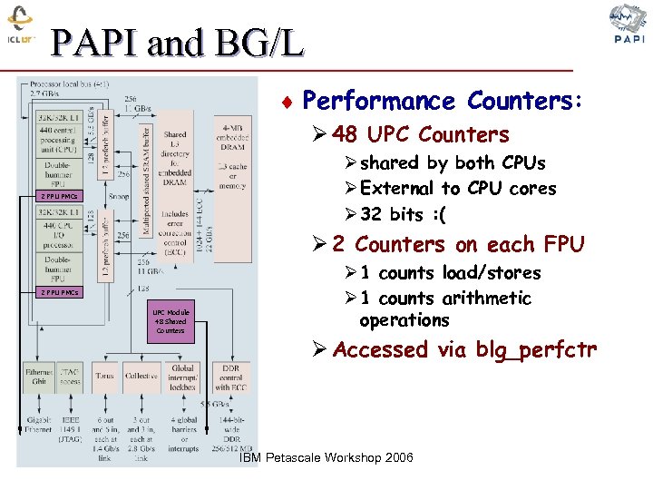 PAPI and BG/L ¨ Performance Counters: Ø 48 UPC Counters Ø shared by both CPUs Ø External to CPU cores Ø 32 bits : ( 2 FPU PMCs Ø 2 Counters on each FPU 2 FPU PMCs UPC Module 48 Shared Counters Ø 1 counts load/stores Ø 1 counts arithmetic operations Ø Accessed via blg_perfctr IBM Petascale Workshop 2006