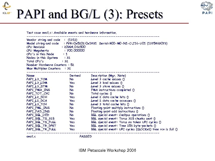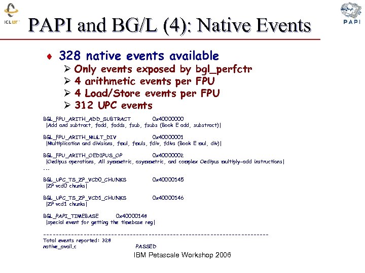 PAPI and BG/L (4): Native Events ¨ 328 native events available Ø Ø Only events exposed by bgl_perfctr 4 arithmetic events per FPU 4 Load/Store events per FPU 312 UPC events BGL_FPU_ARITH_ADD_SUBTRACT 0 x 40000000 |Add and subtract, fadds, fsubs (Book E add, substract)| BGL_FPU_ARITH_MULT_DIV 0 x 40000001 |Multiplication and divisions, fmuls, fdivs (Book E mul, div)| BGL_FPU_ARITH_OEDIPUS_OP 0 x 40000002 |Oedipus operations, All symmetric, and complex Oedipus multiply-add instructions|. . . BGL_UPC_TS_ZP_VCD 0_CHUNKS |ZP vcd 0 chunks| 0 x 40000145 BGL_UPC_TS_ZP_VCD 1_CHUNKS |ZP vcd 1 chunks| 0 x 40000146 BGL_PAPI_TIMEBASE 0 x 40000148 |special event for getting the timebase reg| ------------------------------------Total events reported: 328 native_avail. c PASSED IBM Petascale Workshop 2006
