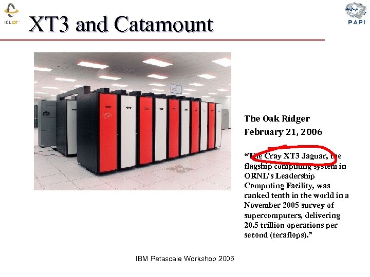 XT 3 and Catamount The Oak Ridger February 21, 2006 “The Cray XT 3 Jaguar, the flagship computing system in ORNL's Leadership Computing Facility, was ranked tenth in the world in a November 2005 survey of supercomputers, delivering 20. 5 trillion operations per second (teraflops). ” IBM Petascale Workshop 2006