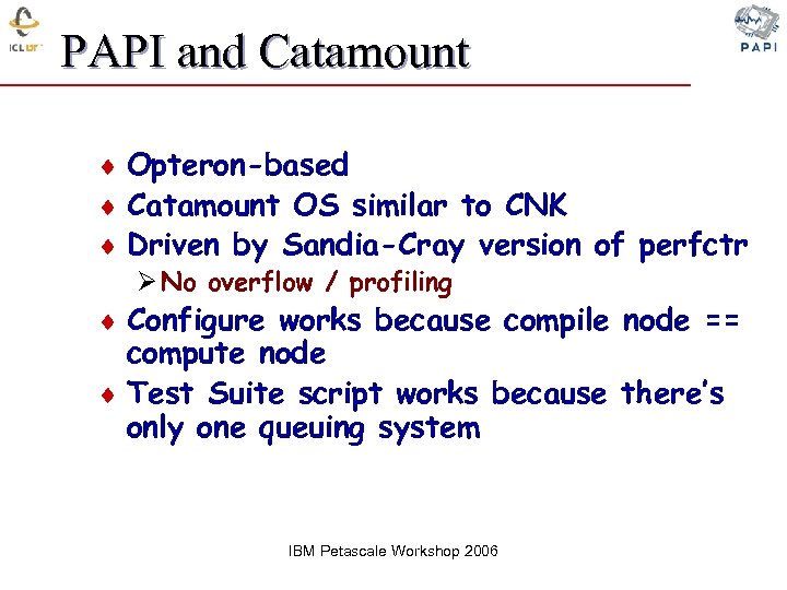 PAPI and Catamount ¨ Opteron-based ¨ Catamount OS similar to CNK ¨ Driven by Sandia-Cray version of perfctr Ø No overflow / profiling ¨ Configure works because compile node == compute node ¨ Test Suite script works because there’s only one queuing system IBM Petascale Workshop 2006