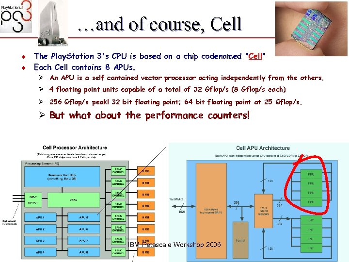 …and of course, Cell The Play. Station 3's CPU is based on a chip codenamed "Cell" ¨ Each Cell contains 8 APUs. ¨ Ø An APU is a self contained vector processor acting independently from the others. Ø 4 floating point units capable of a total of 32 Gflop/s (8 Gflop/s each) Ø 256 Gflop/s peak! 32 bit floating point; 64 bit floating point at 25 Gflop/s. Ø But what about the performance counters! IBM Petascale Workshop 2006