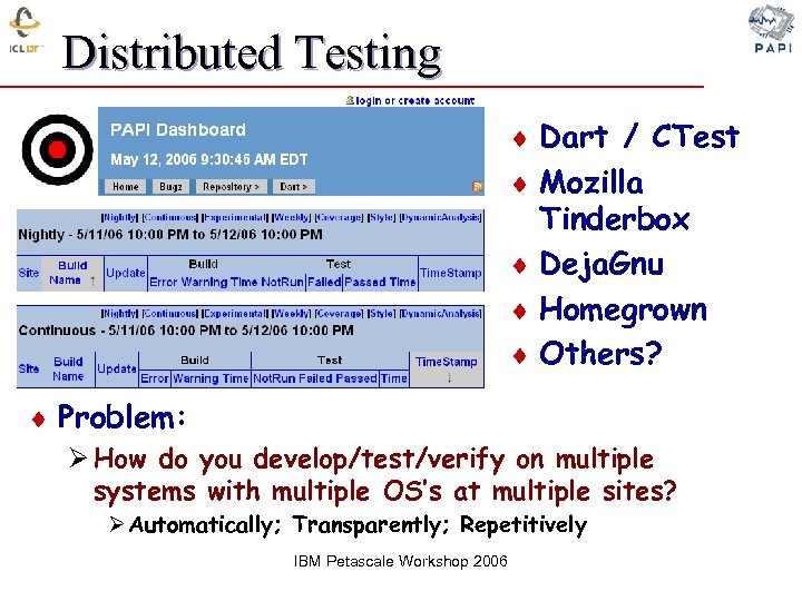 Distributed Testing ¨ Dart / CTest ¨ Mozilla Tinderbox ¨ Deja. Gnu ¨ Homegrown ¨ Others? ¨ Problem: Ø How do you develop/test/verify on multiple systems with multiple OS’s at multiple sites? Ø Automatically; Transparently; Repetitively IBM Petascale Workshop 2006