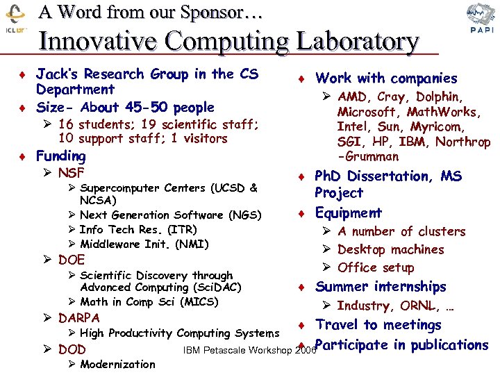 A Word from our Sponsor… Innovative Computing Laboratory ¨ Jack’s Research Group in the CS Department ¨ Size- About 45 -50 people Ø 16 students; 19 scientific staff; 10 support staff; 1 visitors ¨ Funding Ø NSF Ø Supercomputer Centers (UCSD & NCSA) Ø Next Generation Software (NGS) Ø Info Tech Res. (ITR) Ø Middleware Init. (NMI) Ø DOE Ø Scientific Discovery through Advanced Computing (Sci. DAC) Ø Math in Comp Sci (MICS) Ø DARPA Ø High Productivity Computing Systems Ø DOD Ø Modernization ¨ Work with companies Ø AMD, Cray, Dolphin, Microsoft, Math. Works, Intel, Sun, Myricom, SGI, HP, IBM, Northrop -Grumman ¨ Ph. D Dissertation, MS Project ¨ Equipment Ø A number of clusters Ø Desktop machines Ø Office setup ¨ Summer internships Ø Industry, ORNL, … ¨ Travel to meetings ¨ IBM Petascale Workshop 2006 Participate in publications