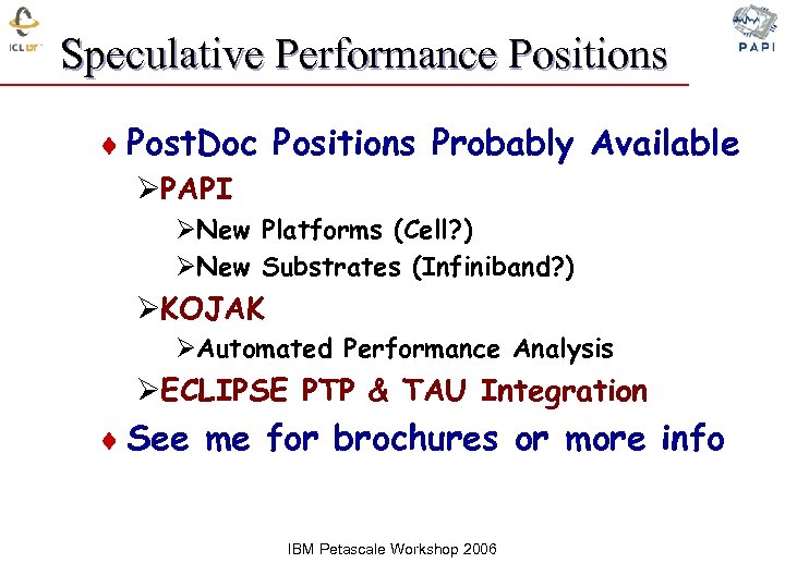 Speculative Performance Positions ¨ Post. Doc Positions Probably Available ØPAPI ØNew Platforms (Cell? ) ØNew Substrates (Infiniband? ) ØKOJAK ØAutomated Performance Analysis ØECLIPSE PTP & TAU Integration ¨ See me for brochures or more info IBM Petascale Workshop 2006