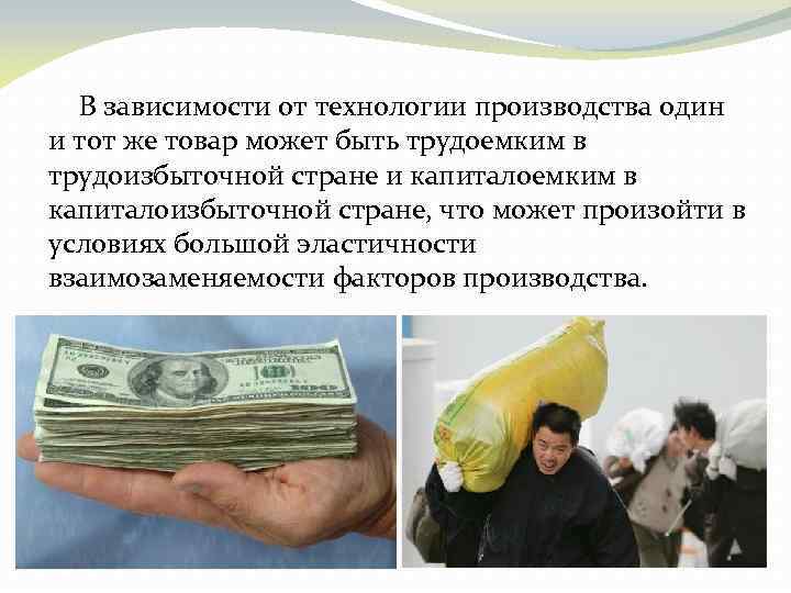 В зависимости от технологии производства один и тот же товар может быть трудоемким в трудоизбыточной стране и капиталоемким в капиталоизбыточной стране, что может произойти в условиях большой эластичности взаимозаменяемости факторов производства.