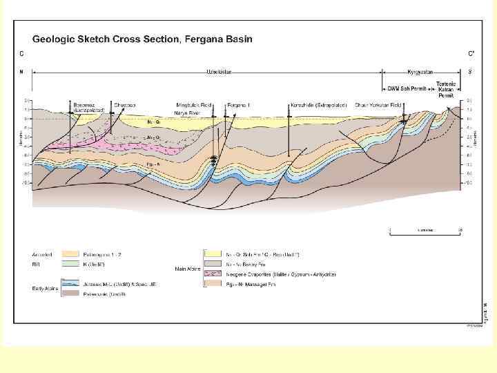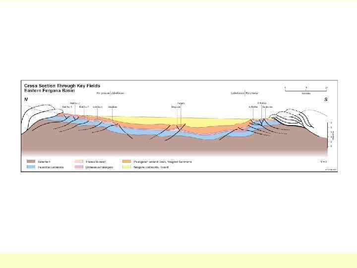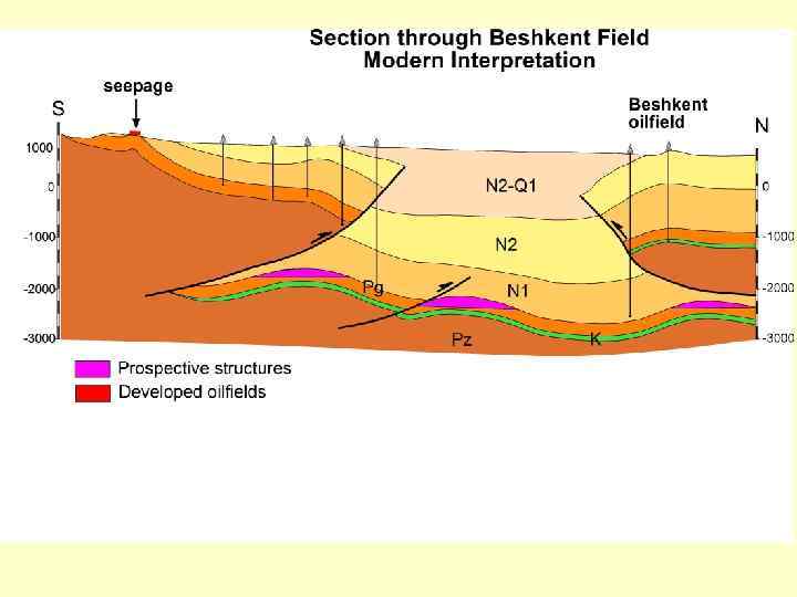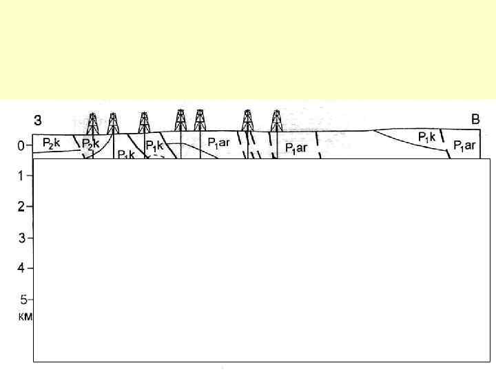 Различная реализация сжимающих деформаций на разных уровнях глубинности (ближе к фундаменту надвиговая система, выше – «нормальная» складчатость)