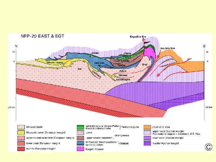 Складчато-покровная модель формирования Альпийского орогена The geologist Argand adopted between 1909 and 1934 the idea of nappes in the geology of the Alps, here a generalized view of the Europe-vergent Alpine belt. Note that the Eastern Alps (4) override the western Alpine nappe stack (2 -3), and its root zone is indented and back-folded by the Southalpine hinterland, in turn deformed by south-vergent thrust. The Western Alps consist of ophiolite-bearing cover sequences (3) and Penninic nappes (2), squeezed out from the contraction of Alpine geosyncline (I -III: Simplon-Ticino nappes; IV-V-VI: Gran St. Bernard-Monte Rosa-Dent Blanche nappes), and overthrown onto the sliced (a-b: Helvetic basement) and undeformed (c) European foreland (1).