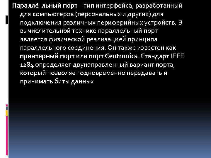 Паралле льный порт— тип интерфейса, разработанный для компьютеров (персональных и других) для подключения различных периферийных устройств. В вычислительной технике параллельный порт является физической реализацией принципа параллельного соединения. Он также известен как принтерный порт или порт Centronics. Стандарт IEEE 1284 определяет двунаправленный вариант порта, который позволяет одновременно передавать и принимать биты данных