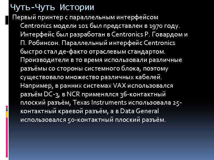 Чуть-Чуть Истории Первый принтер с параллельным интерфейсом Centronics модели 101 был представлен в 1970 году. Интерфейс был разработан в Centronics Р. Говардом и П. Робинсон. Параллельный интерфейс Centronics быстро стал де-факто отраслевым стандартом. Производители в то время использовали различные разъёмы со стороны системного блока, поэтому существовало множество различных кабелей. Например, в ранних системах VAX использовался разъём DC-3, в NCR применялся 36 -контактный плоский разъём, Texas Instruments использовала 25 контактный краевой разъём, а в Data General использовался 50 -контактный плоский разъём.