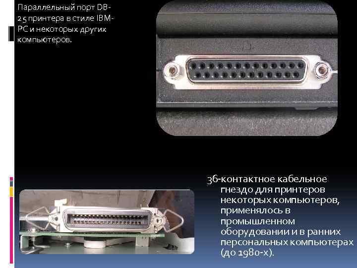 Параллельный порт DB 25 принтера в стиле IBMPC и некоторых других компьютеров. 36 -контактное кабельное гнездо для принтеров некоторых компьютеров, применялось в промышленном оборудовании и в ранних персональных компьютерах (до 1980 -х).