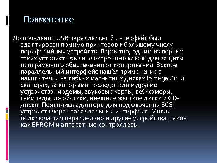 Применение До появления USB параллельный интерфейс был адаптирован помимо принтеров к большому числу периферийных устройств. Вероятно, одним из первых таких устройств были электронные ключи для защиты программного обеспечения от копирования. Вскоре параллельный интерфейс нашёл применение в накопителях на гибких магнитных дисках Iomega Zip и сканерах, за которыми последовали и другие устройства: модемы, звуковые карты, веб-камеры, геймпады, джойстики, внешние жёсткие диски и CDдиски. Появились адаптеры для подключения SCSI устройств через параллельный интерфейс. Могли подключаться параллельно и другие устройства, такие как EPROM и аппаратные контроллеры.