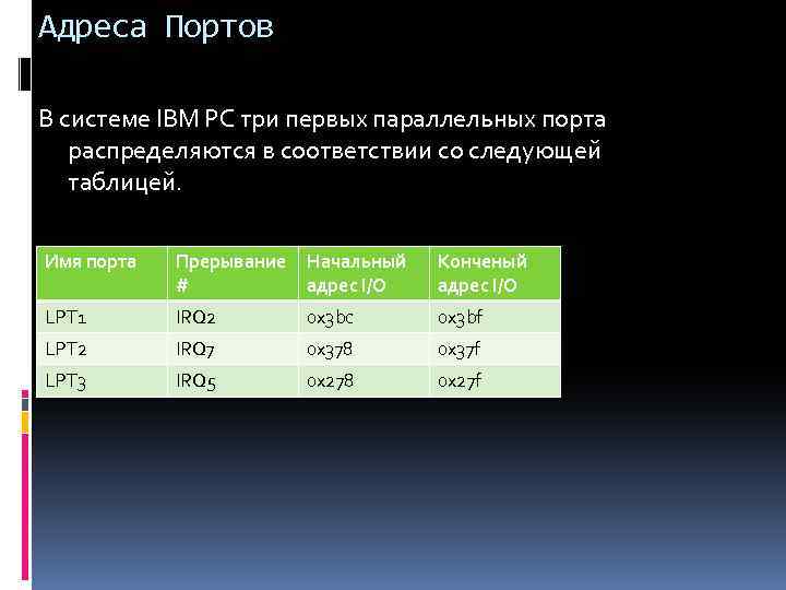 Адреса Портов В системе IBM PC три первых параллельных порта распределяются в соответствии со следующей таблицей. Имя порта Прерывание # Начальный адрес I/O Конченый адрес I/O LPT 1 IRQ 2 0 x 3 bc 0 x 3 bf LPT 2 IRQ 7 0 x 378 0 x 37 f LPT 3 IRQ 5 0 x 278 0 x 27 f