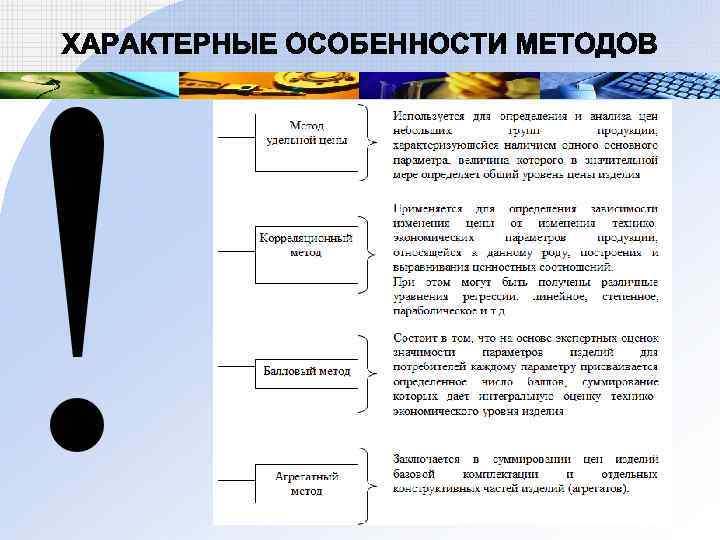 § Параметрические методы разновидность расчетных методов ценообразования, которые используются при формировании цен на аналогичную продукцию, формирующую так называемый параметрический ряд. Метод удельной цены Балловый метод Агрегатный метод Корреляционный метод
