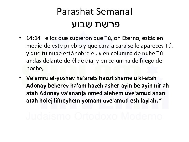 Parashat Semanal פרשת שבוע • 14: 14 ellos que supieron que Tú, oh Eterno, estás en medio de este pueblo y que cara a cara se le apareces Tú, y que tu nube está sobre el, y en columna de nube Tú andas delante de él de día, y en columna de fuego de noche, • Ve'amru el-yoshev ha'arets hazot shame'u ki-atah Adonay bekerev ha'am hazeh asher-ayin be'ayin nir'ah atah Adonay va'ananja omed alehem uve'amud anan atah holej lifneyhem yomam uve'amud esh laylah. “