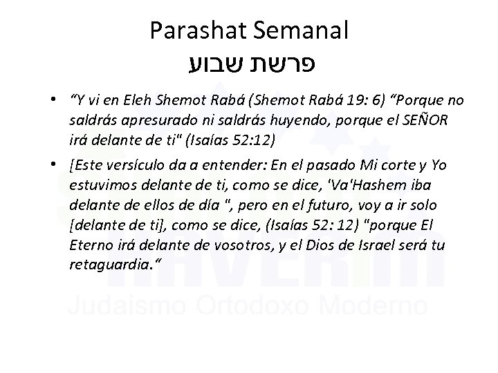 Parashat Semanal פרשת שבוע • “Y vi en Eleh Shemot Rabá (Shemot Rabá 19: 6) “Porque no saldrás apresurado ni saldrás huyendo, porque el SEÑOR irá delante de ti" (Isaías 52: 12) • [Este versículo da a entender: En el pasado Mi corte y Yo estuvimos delante de ti, como se dice, 'Va'Hashem iba delante de ellos de día ", pero en el futuro, voy a ir solo [delante de ti], como se dice, (Isaías 52: 12) "porque El Eterno irá delante de vosotros, y el Dios de Israel será tu retaguardia. “