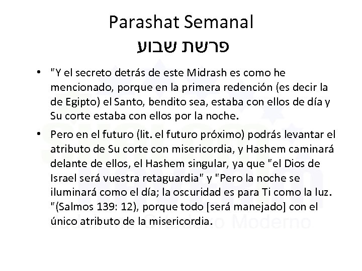 Parashat Semanal פרשת שבוע • "Y el secreto detrás de este Midrash es como he mencionado, porque en la primera redención (es decir la de Egipto) el Santo, bendito sea, estaba con ellos de día y Su corte estaba con ellos por la noche. • Pero en el futuro (lit. el futuro próximo) podrás levantar el atributo de Su corte con misericordia, y Hashem caminará delante de ellos, el Hashem singular, ya que "el Dios de Israel será vuestra retaguardia" y "Pero la noche se iluminará como el día; la oscuridad es para Ti como la luz. "(Salmos 139: 12), porque todo [será manejado] con el único atributo de la misericordia.