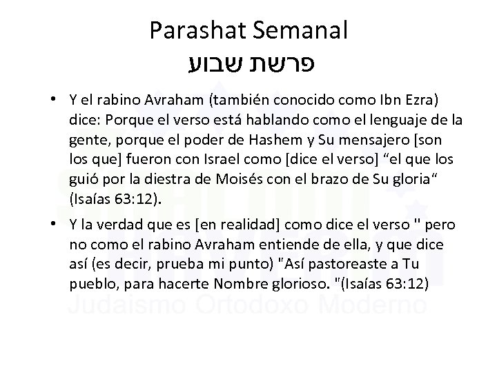 Parashat Semanal פרשת שבוע • Y el rabino Avraham (también conocido como Ibn Ezra) dice: Porque el verso está hablando como el lenguaje de la gente, porque el poder de Hashem y Su mensajero [son los que] fueron con Israel como [dice el verso] “el que los guió por la diestra de Moisés con el brazo de Su gloria“ (Isaías 63: 12). • Y la verdad que es [en realidad] como dice el verso '' pero no como el rabino Avraham entiende de ella, y que dice así (es decir, prueba mi punto) "Así pastoreaste a Tu pueblo, para hacerte Nombre glorioso. "(Isaías 63: 12)