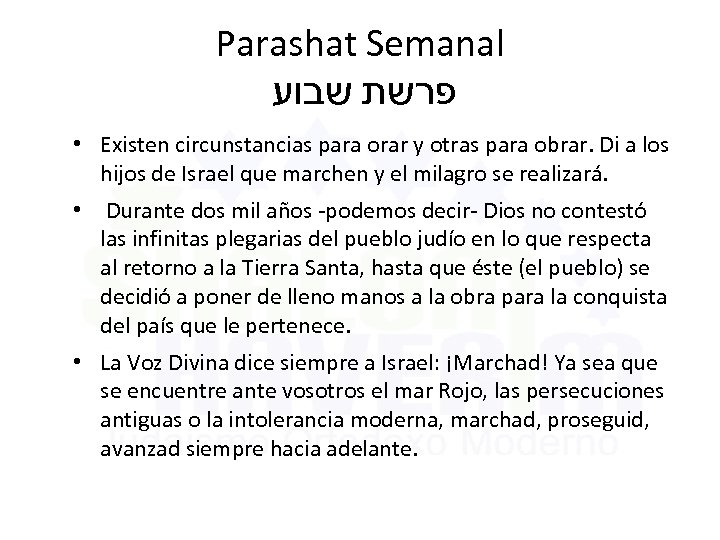 Parashat Semanal פרשת שבוע • Existen circunstancias para orar y otras para obrar. Di a los hijos de Israel que marchen y el milagro se realizará. • Durante dos mil años -podemos decir- Dios no contestó las infinitas plegarias del pueblo judío en lo que respecta al retorno a la Tierra Santa, hasta que éste (el pueblo) se decidió a poner de lleno manos a la obra para la conquista del país que le pertenece. • La Voz Divina dice siempre a Israel: ¡Marchad! Ya sea que se encuentre ante vosotros el mar Rojo, las persecuciones antiguas o la intolerancia moderna, marchad, proseguid, avanzad siempre hacia adelante.