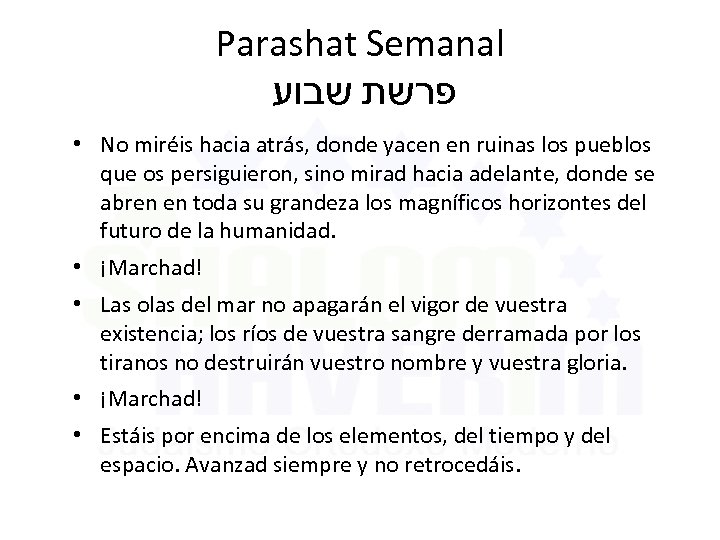 Parashat Semanal פרשת שבוע • No miréis hacia atrás, donde yacen en ruinas los pueblos que os persiguieron, sino mirad hacia adelante, donde se abren en toda su grandeza los magníficos horizontes del futuro de la humanidad. • ¡Marchad! • Las olas del mar no apagarán el vigor de vuestra existencia; los ríos de vuestra sangre derramada por los tiranos no destruirán vuestro nombre y vuestra gloria. • ¡Marchad! • Estáis por encima de los elementos, del tiempo y del espacio. Avanzad siempre y no retrocedáis.