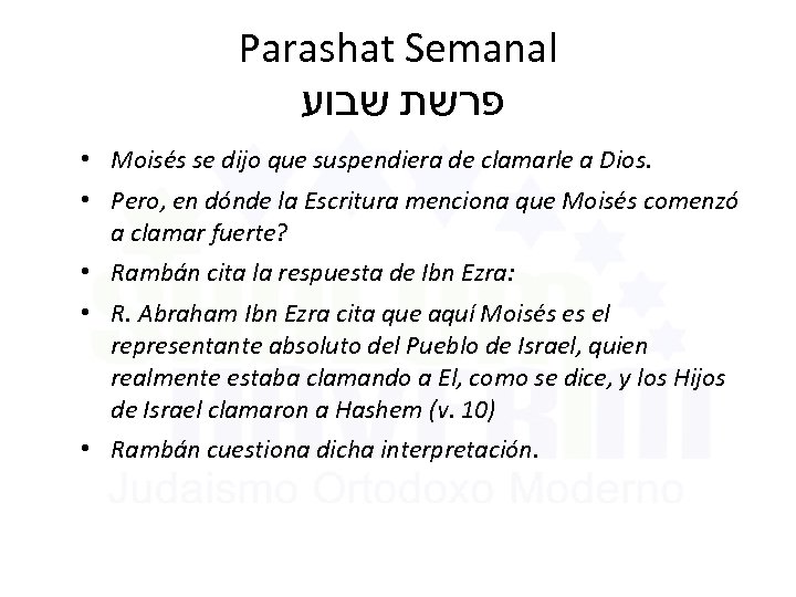 Parashat Semanal פרשת שבוע • Moisés se dijo que suspendiera de clamarle a Dios. • Pero, en dónde la Escritura menciona que Moisés comenzó a clamar fuerte? • Rambán cita la respuesta de Ibn Ezra: • R. Abraham Ibn Ezra cita que aquí Moisés es el representante absoluto del Pueblo de Israel, quien realmente estaba clamando a El, como se dice, y los Hijos de Israel clamaron a Hashem (v. 10) • Rambán cuestiona dicha interpretación.