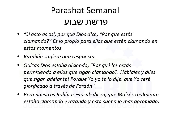 Parashat Semanal פרשת שבוע • “Si esto es así, por que Dios dice, “Por que estás clamando? ” Es lo propio para ellos que estén clamando en estos momentos. • Rambán sugiere una respuesta. • Quizás Dios estaba diciendo, “Por qué les estás permitiendo a ellos que sigan clamando? . Háblales y diles que sigan adelante! Porque Yo ya te lo dije, que Yo seré glorificado a través de Faraón”. • Pero nuestros Rabinos –Jazal- dicen, que Moisés realmente estaba clamando y rezando y esto suena lo mas apropiado.