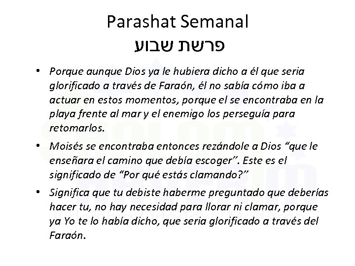 Parashat Semanal פרשת שבוע • Porque aunque Dios ya le hubiera dicho a él que seria glorificado a través de Faraón, él no sabía cómo iba a actuar en estos momentos, porque el se encontraba en la playa frente al mar y el enemigo los perseguía para retomarlos. • Moisés se encontraba entonces rezándole a Dios “que le enseñara el camino que debía escoger”. Este es el significado de “Por qué estás clamando? ” • Significa que tu debiste haberme preguntado que deberías hacer tu, no hay necesidad para llorar ni clamar, porque ya Yo te lo había dicho, que seria glorificado a través del Faraón.