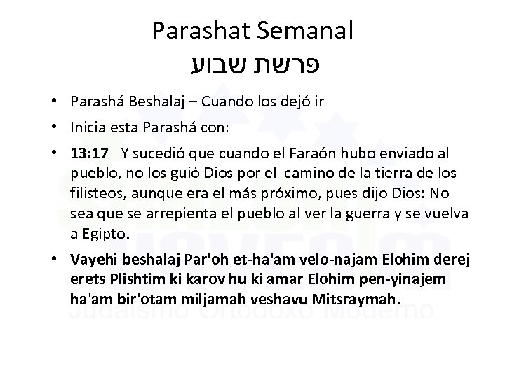 Parashat Semanal פרשת שבוע • Parashá Beshalaj – Cuando los dejó ir • Inicia esta Parashá con: • 13: 17 Y sucedió que cuando el Faraón hubo enviado al pueblo, no los guió Dios por el camino de la tierra de los filisteos, aunque era el más próximo, pues dijo Dios: No sea que se arrepienta el pueblo al ver la guerra y se vuelva a Egipto. • Vayehi beshalaj Par'oh et-ha'am velo-najam Elohim derej erets Plishtim ki karov hu ki amar Elohim pen-yinajem ha'am bir'otam miljamah veshavu Mitsraymah.
