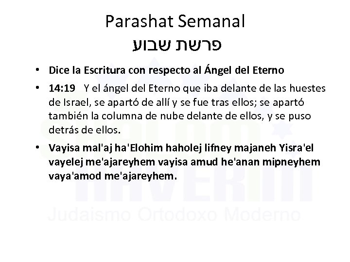 Parashat Semanal פרשת שבוע • Dice la Escritura con respecto al Ángel del Eterno • 14: 19 Y el ángel del Eterno que iba delante de las huestes de Israel, se apartó de allí y se fue tras ellos; se apartó también la columna de nube delante de ellos, y se puso detrás de ellos. • Vayisa mal'aj ha'Elohim haholej lifney majaneh Yisra'el vayelej me'ajareyhem vayisa amud he'anan mipneyhem vaya'amod me'ajareyhem.