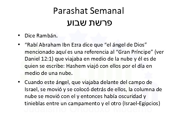 Parashat Semanal פרשת שבוע • Dice Rambán. • “Rabí Abraham Ibn Ezra dice que “el ángel de Dios” mencionado aquí es una referencia al “Gran Príncipe” (ver Daniel 12: 1) que viajaba en medio de la nube y él es de quien se escribe: Hashem viajó con ellos por el día en medio de una nube. • Cuando este ángel, que viajaba delante del campo de Israel, se movió y se colocó detrás de ellos, la columna de nube se movió con el y entonces había oscuridad y tinieblas entre un campamento y el otro (Israel-Egipcios)