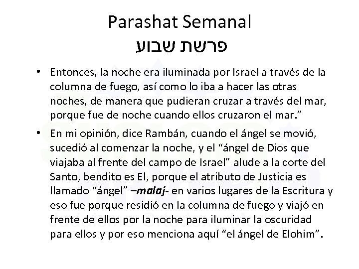Parashat Semanal פרשת שבוע • Entonces, la noche era iluminada por Israel a través de la columna de fuego, así como lo iba a hacer las otras noches, de manera que pudieran cruzar a través del mar, porque fue de noche cuando ellos cruzaron el mar. ” • En mi opinión, dice Rambán, cuando el ángel se movió, sucedió al comenzar la noche, y el “ángel de Dios que viajaba al frente del campo de Israel” alude a la corte del Santo, bendito es El, porque el atributo de Justicia es llamado “ángel” –malaj- en varios lugares de la Escritura y eso fue porque residió en la columna de fuego y viajó en frente de ellos por la noche para iluminar la oscuridad para ellos y por eso menciona aquí “el ángel de Elohim”.