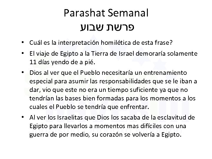 Parashat Semanal פרשת שבוע • Cuál es la interpretación homilética de esta frase? • El viaje de Egipto a la Tierra de Israel demoraría solamente 11 días yendo de a pié. • Dios al ver que el Pueblo necesitaría un entrenamiento especial para asumir las responsabilidades que se le iban a dar, vio que este no era un tiempo suficiente ya que no tendrían las bases bien formadas para los momentos a los cuales el Pueblo se tendría que enfrentar. • Al ver los Israelitas que Dios los sacaba de la esclavitud de Egipto para llevarlos a momentos mas difíciles con una guerra de por medio, su corazón se volvería a Egipto.