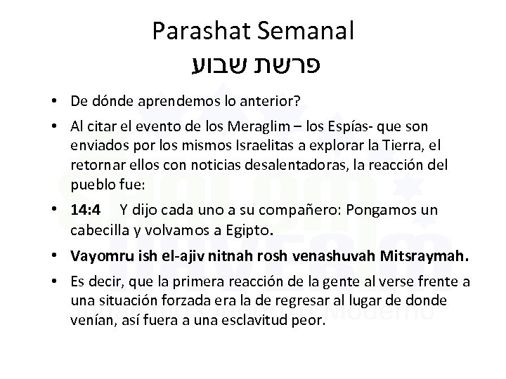 Parashat Semanal פרשת שבוע • De dónde aprendemos lo anterior? • Al citar el evento de los Meraglim – los Espías- que son enviados por los mismos Israelitas a explorar la Tierra, el retornar ellos con noticias desalentadoras, la reacción del pueblo fue: • 14: 4 Y dijo cada uno a su compañero: Pongamos un cabecilla y volvamos a Egipto. • Vayomru ish el-ajiv nitnah rosh venashuvah Mitsraymah. • Es decir, que la primera reacción de la gente al verse frente a una situación forzada era la de regresar al lugar de donde venían, así fuera a una esclavitud peor.