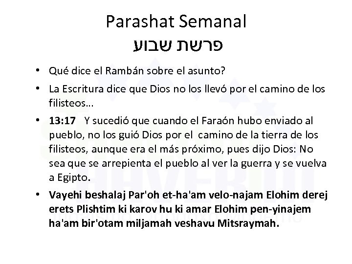 Parashat Semanal פרשת שבוע • Qué dice el Rambán sobre el asunto? • La Escritura dice que Dios no los llevó por el camino de los filisteos… • 13: 17 Y sucedió que cuando el Faraón hubo enviado al pueblo, no los guió Dios por el camino de la tierra de los filisteos, aunque era el más próximo, pues dijo Dios: No sea que se arrepienta el pueblo al ver la guerra y se vuelva a Egipto. • Vayehi beshalaj Par'oh et-ha'am velo-najam Elohim derej erets Plishtim ki karov hu ki amar Elohim pen-yinajem ha'am bir'otam miljamah veshavu Mitsraymah.