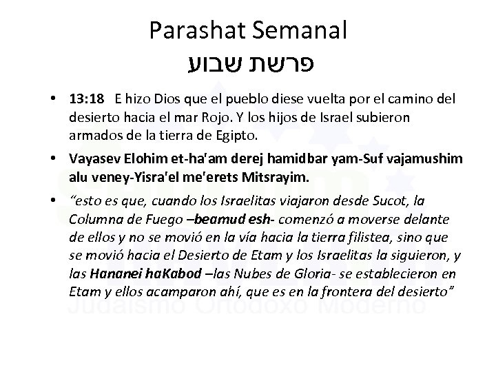 Parashat Semanal פרשת שבוע • 13: 18 E hizo Dios que el pueblo diese vuelta por el camino del desierto hacia el mar Rojo. Y los hijos de Israel subieron armados de la tierra de Egipto. • Vayasev Elohim et-ha'am derej hamidbar yam-Suf vajamushim alu veney-Yisra'el me'erets Mitsrayim. • “esto es que, cuando los Israelitas viajaron desde Sucot, la Columna de Fuego –beamud esh- comenzó a moverse delante de ellos y no se movió en la vía hacia la tierra filistea, sino que se movió hacia el Desierto de Etam y los Israelitas la siguieron, y las Hananei ha. Kabod –las Nubes de Gloria- se establecieron en Etam y ellos acamparon ahí, que es en la frontera del desierto”