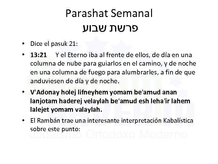 Parashat Semanal פרשת שבוע • Dice el pasuk 21: • 13: 21 Y el Eterno iba al frente de ellos, de día en una columna de nube para guiarlos en el camino, y de noche en una columna de fuego para alumbrarles, a fin de que anduviesen de día y de noche. • V'Adonay holej lifneyhem yomam be'amud anan lanjotam haderej velaylah be'amud esh leha'ir lahem lalejet yomam valaylah. • El Rambán trae una interesante interpretación Kabalística sobre este punto: