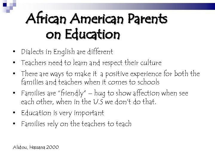 African American Parents on Education • Dialects in English are different • Teachers need to learn and respect their culture • There are ways to make it a positive experience for both the families and teachers when it comes to schools • Families are “friendly” – hug to show affection when see each other, when in the U. S we don’t do that. • Education is very important • Families rely on the teachers to teach Alidou, Hassana 2000