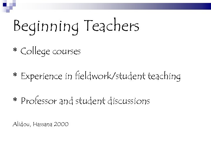 Beginning Teachers * College courses * Experience in fieldwork/student teaching * Professor and student discussions Alidou, Hassana 2000