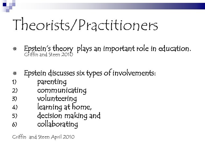 Theorists/Practitioners Epstein’s theory plays an important role in education. 1) 2) 3) 4) 5) 6) Epstein discusses six types of involvements: parenting communicating volunteering learning at home, decision making and collaborating Griffin and Steen 2010 Griffin and Steen April 2010