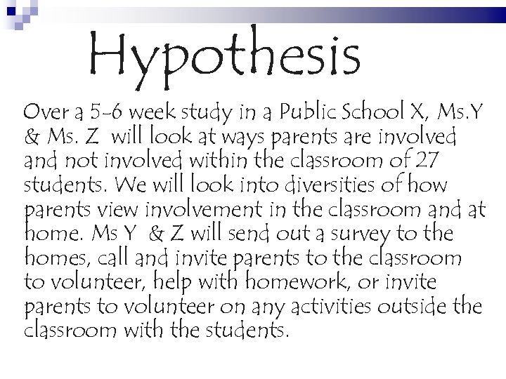 Hypothesis Over a 5 -6 week study in a Public School X, Ms. Y & Ms. Z will look at ways parents are involved and not involved within the classroom of 27 students. We will look into diversities of how parents view involvement in the classroom and at home. Ms Y & Z will send out a survey to the homes, call and invite parents to the classroom to volunteer, help with homework, or invite parents to volunteer on any activities outside the classroom with the students.