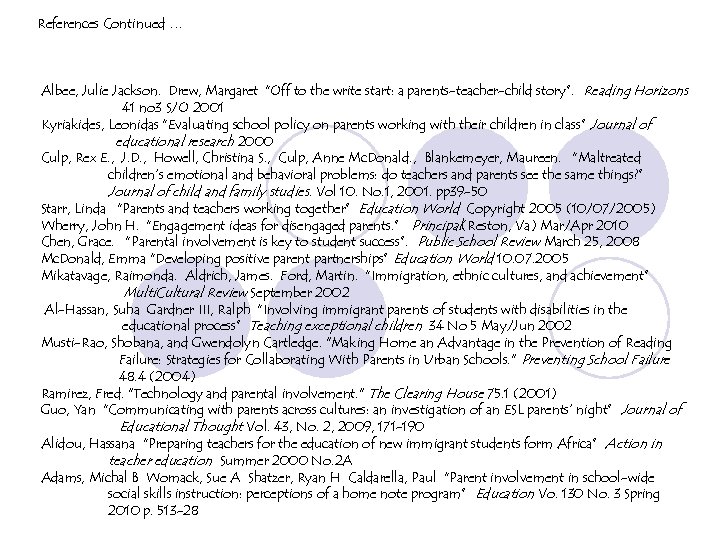 References Continued … Albee, Julie Jackson. Drew, Margaret “Off to the write start: a parents-teacher-child story”. Reading Horizons 41 no 3 S/O 2001 Kyriakides, Leonidas “Evaluating school policy on parents working with their children in class” Journal of educational research 2000 Culp, Rex E. , J. D. , Howell, Christina S. , Culp, Anne Mc. Donald. , Blankemeyer, Maureen. “Maltreated children’s emotional and behavioral problems: do teachers and parents see the same things? ” Journal of child and family studies. Vol 10. No. 1, 2001. pp 39 -50 Starr, Linda “Parents and teachers working together” Education World Copyright 2005 (10/07/2005) Wherry, John H. “Engagement ideas for disengaged parents. ” Principal(Reston, Va) Mar/Apr 2010 Chen, Grace. “Parental involvement is key to student success”. Public School Review March 25, 2008 Mc. Donald, Emma “Developing positive parent partnerships” Education World 10. 07. 2005 Mikatavage, Raimonda. Aldrich, James. Ford, Martin. “Immigration, ethnic cultures, and achievement” Multi. Cultural Review September 2002 Al-Hassan, Suha Gardner III, Ralph “Involving immigrant parents of students with disabilities in the educational process” Teaching exceptional children 34 No 5 May/Jun 2002 Musti-Rao, Shobana, and Gwendolyn Cartledge. "Making Home an Advantage in the Prevention of Reading Failure: Strategies for Collaborating With Parents in Urban Schools. " Preventing School Failure 48. 4 (2004) Ramirez, Fred. "Technology and parental involvement. " The Clearing House 75. 1 (2001) Guo, Yan “Communicating with parents across cultures: an investigation of an ESL parents’ night” Journal of Educational Thought Vol. 43, No. 2, 2009, 171 -190 Alidou, Hassana “Preparing teachers for the education of new immigrant students form Africa” Action in teacher education Summer 2000 No. 2 A Adams, Michal B Womack, Sue A Shatzer, Ryan H Caldarella, Paul “Parent involvement in school-wide social skills instruction: perceptions of a home note program” Education Vo. 130 No. 3 Spring 2010 p. 513 -28