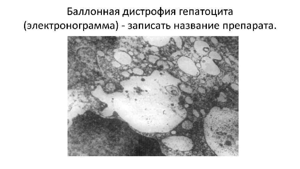 Классификация паренхиматозных белковых дистрофий Вид дистрофии Характеристика Примеры Зернистая дистрофия Артефакт (? ) приготовлении гистологических препаратов --- Увеличение количества органелл (гиперфункция) (? ) --- Патологическое накопление белка в цитоплазме, предшествующее гиалиново-капельной дистрофии (? ) Эпителий извитых канальцев почки протеинурии Гиалиново-капельная дистрофия Патологическое накопление белка в цитоплазме (похож на матрикс гиалинового хряща при окраске гем. -эоз. ) • • • Эпителий извитых канальцев почки протеинурии Тельца Маллори (фрагменты цитоскелета гепатоцитов) Тельца Рассела (Русселя) (перерастянутые цистерны гр. ЭПС в плазмоцитах за счет скопления Ig) Гидропическая дистрофия Патологическое накопление ЖИДКОСТИ (вакуолизация цитоплазмы, мембранных органелл) и белка в цитоплазме, связанное с нарушением проницаемости мембраны клетки и работы ионных помп. Крайняя степень – баллонная дистрофия (со сдавлением вакуолями ядра) • • Эпителий извитых канальцев почки протеинурии Гепатоциты при остром вирусном гепатите Роговая дистрофия (гиперкератоз) Патогенетически не связана с предыдущими видами дистрофий. Причина – гиперпродукция кератина в многослойном плоском эпителии (как ороговевающем, так и нет) • Лейкоплакия многослойного плоского неороговевающего эпителия слизистых оболочек Ихтиоз •